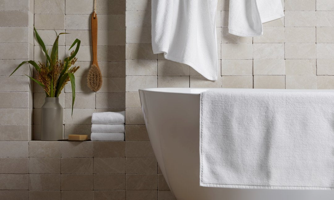Once you’ve decided on the right fabric for you, it’s important to wash your towels before use to remove any silicone coating added during the manufacturing process. Removing this coating releases the fabric’s fibers, allowing them to absorb water more easily. An initial wash also helps remove lint left over from the weaving process.